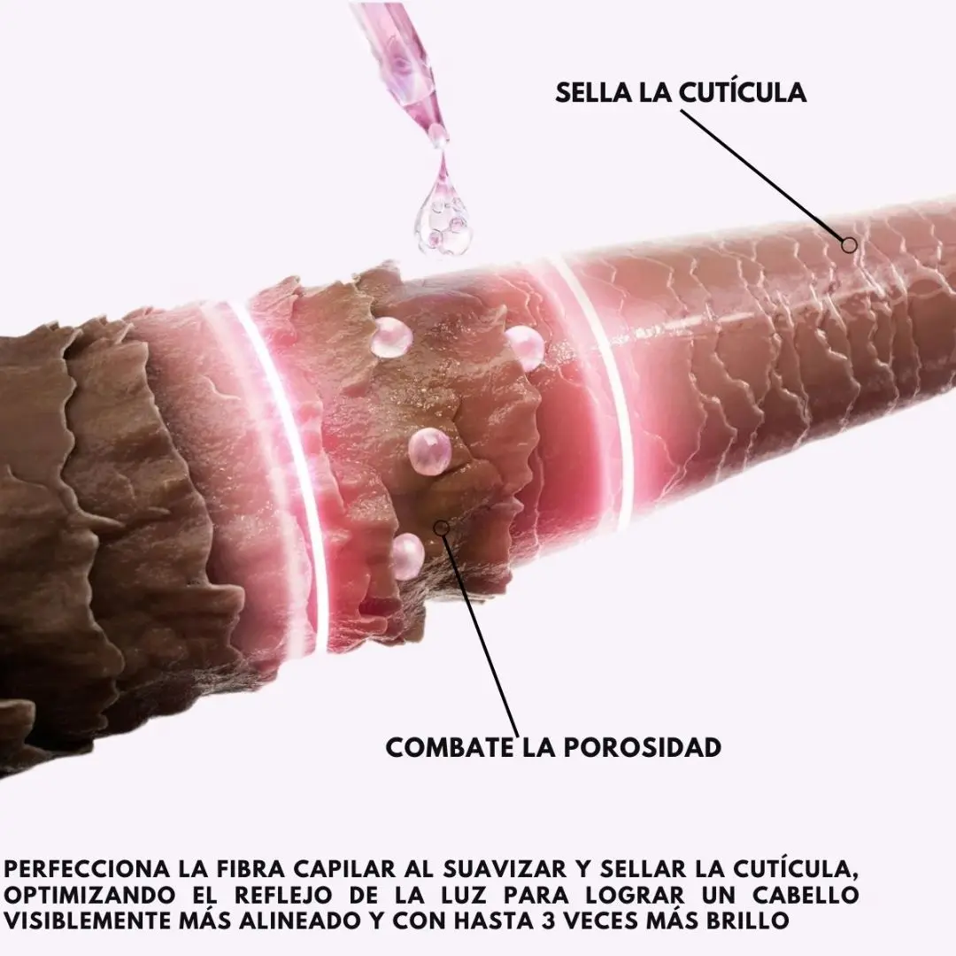 Su fórmula con ácido glicólico y tecnología Gloss actúa sobre la fibra capilar: